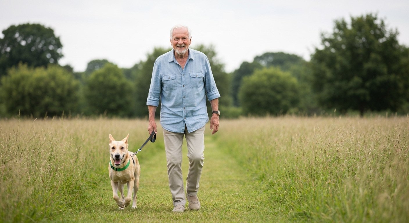 Idoso passeando com cachorro em parque, evidenciando os benefícios da companhia animal para a saúde.