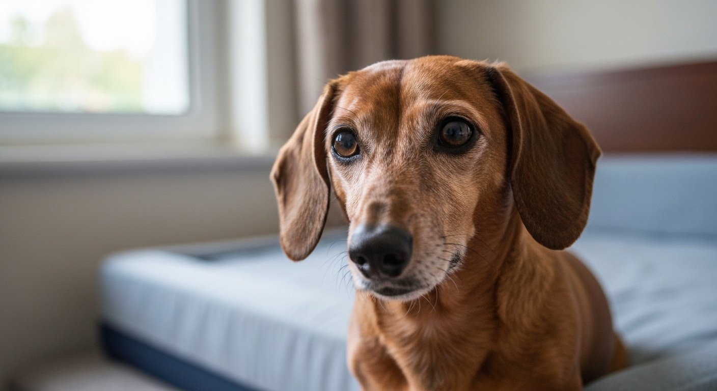 Cão Dachshund de 22 anos, Vô Davi, descansando em sua cama ortopédica, com expressão serena e olhos brilhantes, transmitindo vitalidade e longevidade.